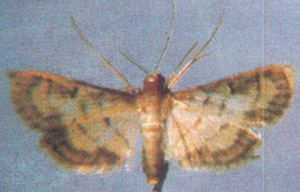 学名 Susumia exigua (Butler)鳞翅目,螟蛾科。别名显纹刷须野螟。分布北起辽宁,南至海南、广东、广西、云南。四川密度最大,有时比稻纵卷叶螟还多。是稻纵卷叶螟的近似种。