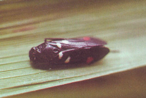 形态特征 成虫体长11—13.5mm,黑色狭长,有光泽,前翅合拢时两侧近平行。头冠稍凸,复眼黑褐色,单眼黄红色。颜面凸出,密被黑色细毛,中脊明显。触角基部2节粗短,黑色。小盾片三角形,顶具1大的梭形凹陷。前翅黑色,近基部具大白斑2个,雄性近端部具肾状大红斑1个,雌性具2个一大一小的红斑。卵长椭圆形,乳白色。若虫共5龄,形状似成虫,初乳白色,后变浅黑色,体表四周具孢沫状液。