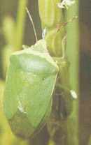 形态特征 成虫全绿型[forma typica(Linnaeus)]体长12一16mm,宽6.0一8.5mm。长椭圆形,青绿色(越冬成虫暗赤褐),腹下色较淡。头近三角形,触角5节,基节黄绿,第3、4、5节末端棕褐,复眼黑,单眼红。咏4节,伸达后足基节,末端黑色。前胸背板边缘黄白色,侧角圆,稍突出,小盾片长三角形,基部有3个横列的小白点,末端狭圆,超过腹部中央。前翅稍长于腹末。足绿色,跗节3节,灰褐,爪末端黑。腹下黄绿或淡绿色,密布黄色斑点。卵杯形,长1.2mm,宽0.8mm,初产黄白色,后转红褐,顶端有盖,周缘白色,精孔突起呈环,约24—30个。若虫一龄若虫体长1.1一1.4mm,腹背中央有3块排成三角形的黑斑,后期黄褐,胸部有一橙黄色圆斑,第2腹节有一长形白斑,第5、6腹节近中央两侧各有4个黄色斑,排成梯形。二龄若虫体长2.0-2.2mm,黑色,前、中胸背板两侧各有一黄斑。三龄若虫体长4.0-4.2mm,黑色,第1、2腹节背面有4个长形的横向白斑,第3腹节至末节背板两侧各具6个,中央两侧各具4个对称的白斑。四龄若虫体长5.2—7.0mm,头部有倒“T”形黑斑,翅芽明显。五龄若虫体长7.5—12mm,绿色为主,触角4节,单眼出现,翅芽伸达第3腹节,前胸与翅芽散生黑色斑点,外缘橙红,腹部边缘具半圆形红斑,中央也具红斑,足赤褐,跗节黑色。