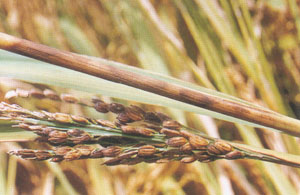 症状 秧苗期至抽穗期均可发病。幼苗染病 叶鞘上生褐色病斑,边缘不明显。分蘖期染病 叶鞘上或叶片中脉上初生针头大小的深褐色小点,向上、下扩展后形成菱形深褐色斑,边缘浅褐色。叶片与叶脉交界处多现褐色大片病斑。孕穗至抽穗期染病 剑叶叶鞘先发病且受害严重,叶鞘上生褐色至暗褐色不规则病斑,中间色浅,这缘黑褐色较清晰,严重的现虎斑纹状病斑,向整个叶鞘上扩展,致叶鞘和幼穗腐烂。湿度大时病斑内外现白色至粉红色霉状物,即病原菌的子实体。