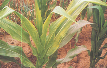症状 又称玉米条矮病。病株节间缩短,植株矮缩,沿叶脉产生褪绿条纹,后条纹上产生坏死褐斑。植株早期受害,生长停滞,提早枯死。中期染病植株矮化,顶叶丛生,雄花不易抽出,植株多向一例倾斜。后期染病矮缩不明显。根据叶片上条纹的宽度分为密纹型和减纹型两种。叶片、茎部、穗轴、髓、雄花序、苞叶及顶端小叶均可受害,产生淡黄色条纹或褐色坏死斑。