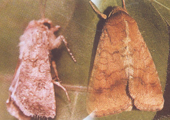 形态特征 成虫体长14—18mm,翅展30—38mm,灰褐色。前翅有褐色肾形纹及环状纹,肾形纹前方前缘脉上具褐纹2条,肾纹外侧具褐色宽横带,端区各脉间生有黑点。后翅淡褐至黄白色,端区黑色或深褐色。卵半球形,0.44—0.48mm,初乳白后黄白色,孵化前深紫色。幼虫体长30—42mm,体色因食物或环境不同变化很大,由淡绿、淡红至红褐或黑紫色。绿色型和红褐色型常见。绿色型,体绿色,背线和亚背线深绿色,气门线浅黄色,体表面布满褐色或灰色小刺。红褐色型,体红褐或淡红色,背线和亚背线淡褐色,气门线白色,毛瘤黑色。腹足趾钩为双序中带,两根前胸侧毛连线与前胸气门下端相切或相交。蛹长17—21mm,黄褐色,腹部第5—7节的背面和腹面具7—8排半圆形刻点,臀棘钩刺2根,尖端微弯。