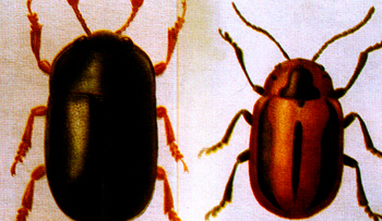 形态特征 成虫体长10mm,宽6mm,体长圆形,背面棕黄色或棕红色;头部前端、前胸背板中部、小盾片、鞘翅中缝、身体腹面、足全为漆黑色;头顶中间及前胸两侧各具小黑斑1个,每个鞘翅中部各生1条长梭形黑色斑,占翅面l/3。头顶几无刻点、光亮,触角第2节近球形,第3—5节较长,余各节粗短。前胸背板拱凸,两侧缘弧状,小盾片半圆形,具少数刻点。鞘翅上刻点比胸部略粗,表面呈皱纹状。(图右)