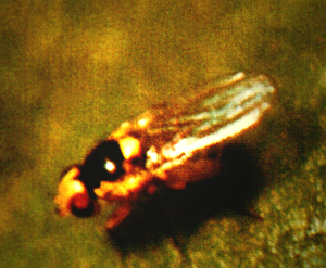 形态特征 成虫翅长约2mm,除复眼、单眼三角区、后头及胸、腹背面大体黑色,其余部分和小盾板基本黄色;成虫内、外顶鬃均着生在黄色区,蛹后气门7—12孔;卵米色,稍透明,大小0.2一0.3×0.1一0.15(mm);幼虫蛆状,初孵无色,渐变黄橙色,老熟时长约3mm;蛹卵形,腹面稍平,橙黄色,大小1.7—2.3×0.5—0.75(mm)。