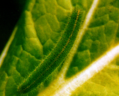 形态特征 成虫与菜粉蝶相似,但前、后翅的外缘各有3—5个三角形黑斑。幼虫与菜青虫相似,虫体暗绿色,体背黑
