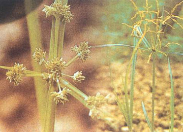 形态特征 秆丛生,株高2—65cm,扁三棱状,叶基生线形,先端渐尖,长4—30cm,宽1—4.5mm,叶鞘紫绿色,伞形花序,苞叶2—3片,具3—8个不等伞柄,顶端着生多数小穗。小穗长圆形,黄褐色,具红棕色膜质鳞片。雄蕊1—2个,柱头3裂。每株可产生数万至数十万小坚果。坚果三棱状倒卵形,浅黄色。靠种子繁殖。(图左)