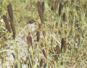 形态特征 茎直立,株高20一60cm。斜伸或基部膝曲,秆丛生,光滑无毛。叶片披针形条状;叶鞘光滑,背部有脊;叶舌有小纤毛。穗状花序4—10多个,簇生在秆顶,小穗排列在穗轴之一侧,有花2—3个,下部花结实,上部花不孕互相孢卷成球状体;颖膜质,第二颖较第一颖长,有短芒。颖果浅棕色,狭椭圆形。靠种子繁殖。