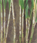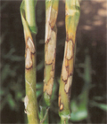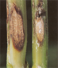 为害症状:主要发生在小麦的叶鞘和茎秆上。小麦拔节后,症状逐渐明显。发病初期,在地表或近地表的叶鞘上产生黄褐色椭圆形或梭形病斑,以后,病部逐渐扩大,颜色变深,并向内侧发展为害茎部,重病株基部一、二节变黑甚至腐烂,常早期死亡。小麦生长中期至后期,叶鞘上的病斑呈云纹状花纹。病斑无规则,严重时包围全叶鞘,使叶鞘及叶片早枯。在田间湿度大,通气性不好的条件下,病鞘与茎秆之间或病斑表面,常产生白色霉状物。在上面,初期散生土黄色或黄褐色的霉状小团,担孢子单细胞,椭圆形或长椭圆形,基部稍尖,无色。