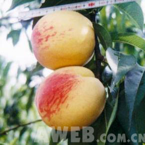 果实广卵圆形,缝合线为白色;果顶有红晕,三年生结果树一般单果重≥200-300g,果实周径13.4㎝,茸毛极少;果皮果肉金黄色,或呈青白色,无红色素;果实多汁、味甜香气浓、无酸味,可溶性固形物含量≥14.3%~15%;粘核,核小。果实贮藏性能特别好,常温下贮藏10天以上,果顶红晕部分果皮皱缩,但肉质不腐烂。该品种具有很高的经济价值及广阔发展前景,是一个十分诱人的开发项目。