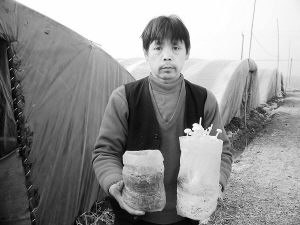 2月7日,在含山县仙踪镇金针菇种植基地,江淮村肖贤根拿出2袋金针菇,一脸愁容。一袋是正常生长的,采过两茬了,另一袋不正常,菌丝都没哩。他家大棚里,有1.2万袋,80%%没长出来。