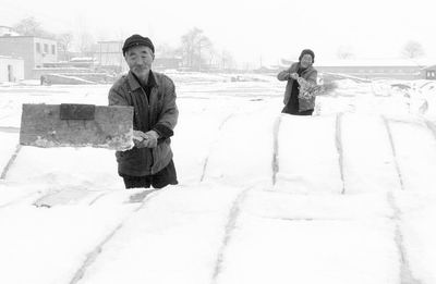 资料图片:大雪过后,农户在清扫蔬菜拱棚上的积雪