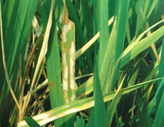 主要危害叶鞘,叶片其次,严重时穗部也发病。发病初期叶鞘近水面处产生暗绿色水状小斑点,后扩大呈椭圆形,似云纹状,多个病斑融合成大斑纹。病斑中央灰绿色或灰白色,边缘暗褐色,湿润状。潮湿时病部可见白色蛛丝状的菌丝体,后期菌丝体集结形成菌核,黏附在病斑上,易脱落。天气特别潮湿时,病部可产生一层白色粉状霉层。